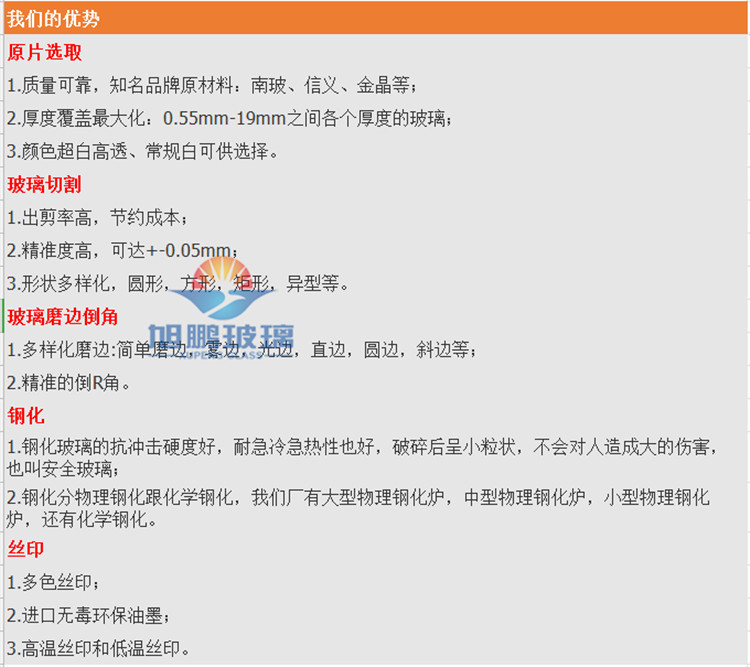 Our professional processing and production: silk screen glass, LCD glass, advertising machine glass, touch screen glass, intelligent control panel glass, LED lamp glass, instrument glass, AR glass (high transmittance glass / anti-reflective glass), AG glass ( A series of high quality glass such as anti-glare glass).